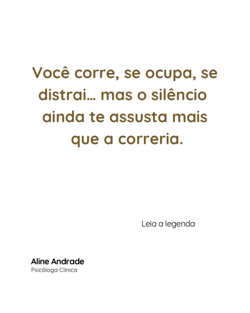 Olha para a sua rotina. Você consegue passar horas resolvendo coisas, respondendo mensagens, indo de uma tarefa para outra. Mas quando sobra um minuto sem barulho, sem distração, você corre para preencher. Liga a TV, abre o celular, inventa uma ocupação qualquer.No fundo, não é falta de tempo. É medo de sentir. Porque na pausa o corpo começa a falar: o cansaço que você empurra, a ansiedade que você disfarça, a insatisfação que insiste em aparecer. É nesse vazio que as perguntas inconvenientes surgem: por que você continua nesse lugar? Até quando vai insistir nesse papel? O que você está adiando olhar?Você se acostumou a acreditar que parar é perda de tempo. Mas a verdadeira perda é viver correndo para não encarar a si mesma. Até onde essa fuga vai te levar?Eu conheço esse incômodo do silêncio que parece maior do que qualquer barulho. Já me vi ocupando cada minuto para não escutar o que ecoava dentro de mim. Na terapia, o silêncio não é um inimigo: ele se torna caminho. Eu posso te ajudar a sustentar esse vazio até que ele revele algo novo, e não apenas mais uma fuga. Aline Andrade Psicóloga Clínica