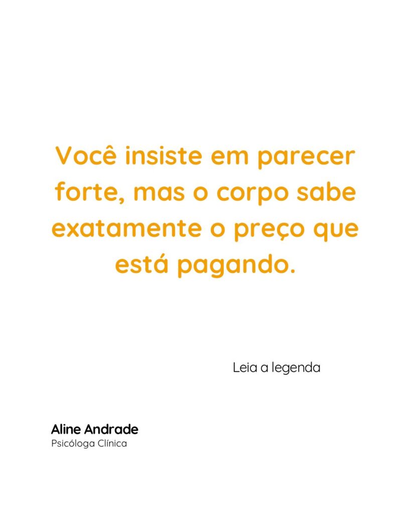 Você provavelmente já viveu isso: dizem que você é forte, que dá conta, que todo mundo pode contar com você. E você sorri, aceita, veste esse papel como se fosse um elogio. Mas no fundo, sabe que não é bem assim.Porque ser “forte” tem custado caro. Você aceita tarefas que não cabem, diz sim quando queria dizer não, sorri para não decepcionar. E quando finalmente está sozinha, seu corpo mostra a conta: dor nas costas, insônia, palpitação, cansaço que não passa.Você pode até enganar os outros, mas o corpo não mente. Ele sabe de cada vez que você ultrapassou seu limite, de cada vez que sacrificou seu descanso para sustentar uma imagem.Quem você está tentando convencer com essa força toda? E até quando vai pagar com a própria saúde o preço de parecer inabalável? Eu já senti na pele o peso de sustentar uma força que só existia por fora, enquanto por dentro o corpo pedia socorro. A terapia foi o lugar onde essa farsa começou a desmoronar e, junto dela, nasceu a possibilidade de uma vida menos sacrificada. Se você também se reconhece nesse papel de “forte”, talvez seja hora de se permitir outro jeito de existir. Aline AndradePsicóloga Clínica