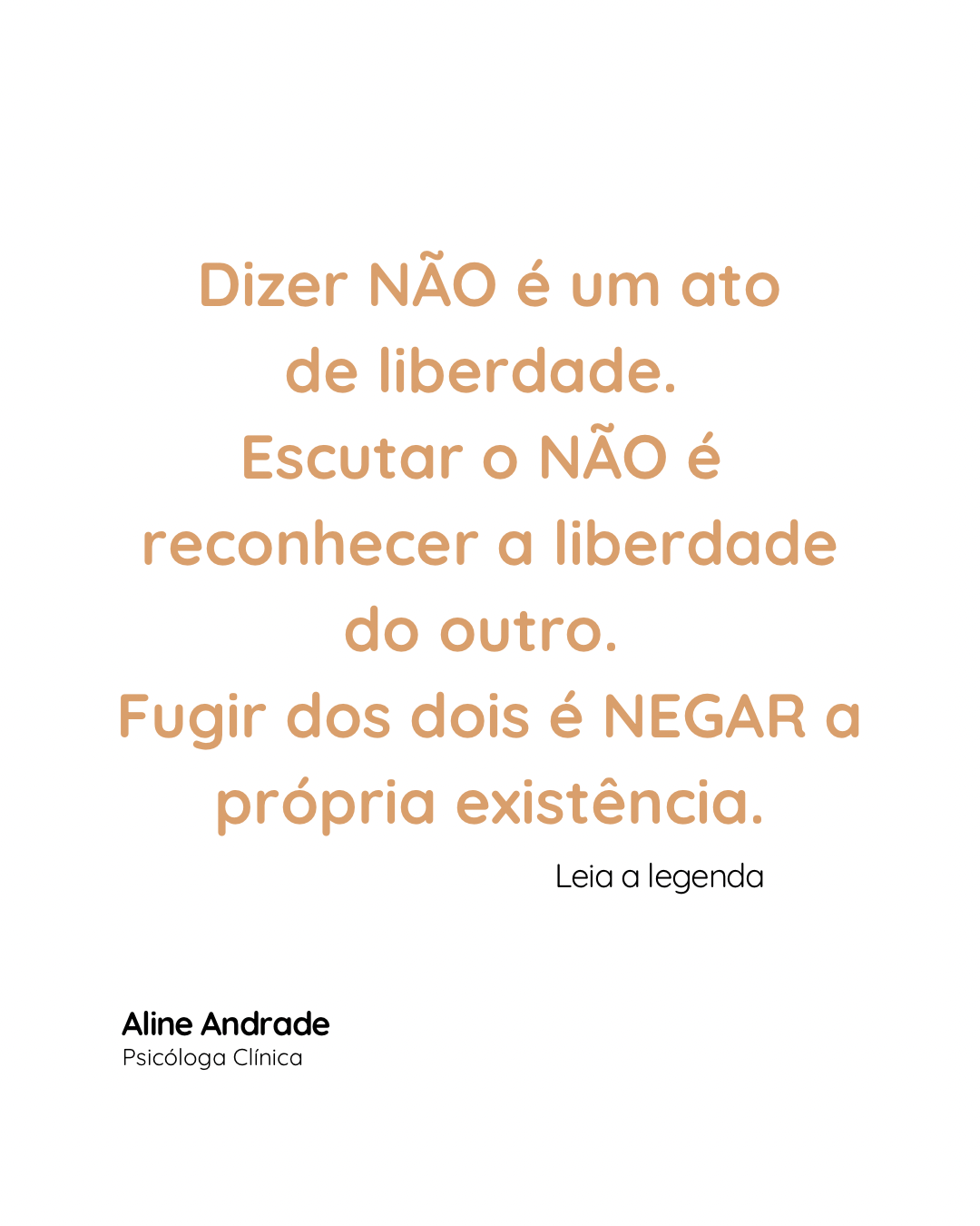 Fomos ensinados que dizer não é falta de educação, egoísmo ou frieza. Por isso, tanta gente aceita o que não quer, engole incômodos e se molda para não ser mal vista ou mal falada. Só que essa tentativa de ser “boa pessoa” tem um preço: quem não sabe dizer não, também não sabe escutar um não. Quando alguém coloca um limite, o incômodo aparece. Vem a raiva, a sensação de rejeição, a leitura de que o outro está sendo injusto. Mas o desconforto é interno: é difícil aceitar que o outro faz o que você não consegue fazer, escolher a si mesmo sem culpa. Nas relações, isso pesa. Quem sempre cede se sente usado. Quem não tolera o não do outro busca controle disfarçado de afeto. A empatia vira distorção: acreditar que ser empático é nunca frustrar ninguém. O existencialismo lembra que todo sim é também um não. Fugir do não é fugir da própria liberdade. Dizer não é um ato de responsabilidade. E escutar um não sem se ofender é sinal de maturidade emocional. Aline AndradePsicóloga Clínica